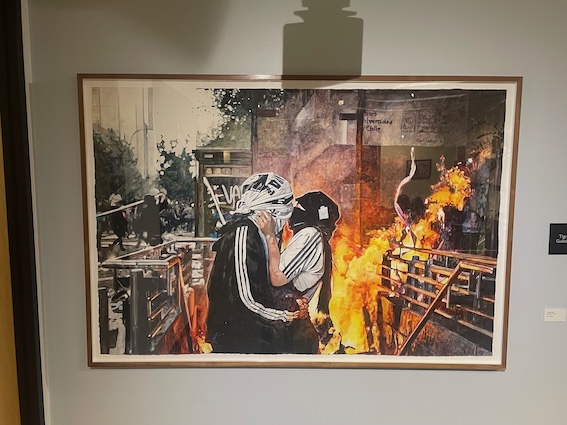 Yes, I do collect art. I’m honoured to be able to buy a piece from each artist participating in our residence programme at each pop-up exhibition. It means a lot to me to be able to live with art and see it every day. In general, I tend to gravitate towards contemporary, figurative art. I like seeing colour, people and words incorporated in artworks. One of my favourite pieces in my collection is a watercolour depicting a couple wearing masks and kissing with a scene of chaos and fire in the background. It was painted by Conrad Ruiz, who based it on a photograph that had appeared in a newspaper following riots in Santiago, Chile. Due to the masks, it seems to take on a new meaning post-Covid. People immediately think it’s COVID-related, but it’s not. It tells a different story. I find it very interesting.