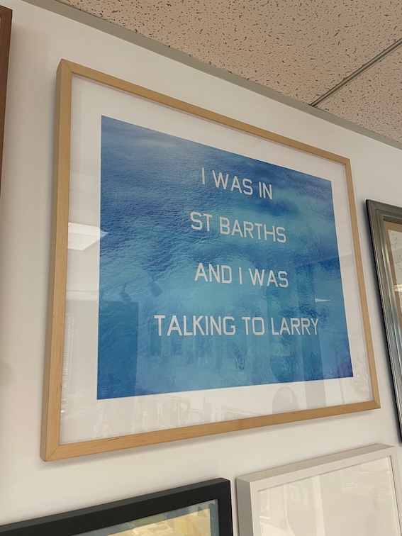 As I mentioned, I like the combination of art and words, such as with works by Edward Ruscha. One time, I travelled to St. Barths, in the Caribbean, and was invited for dinner at Larry Gagosian’s house. Afterwards, I was talking to someone and found myself uttering what sounded like an improbable sentence to me: “I was in St Barths and I was talking to Larry”. So, I made a Ruscha-type artwork out of it.